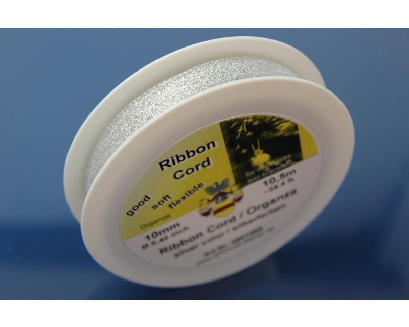 10,5m Organzaband auf Spule, ca. 10mm breit, silberfarben, beidseitig gefasst
