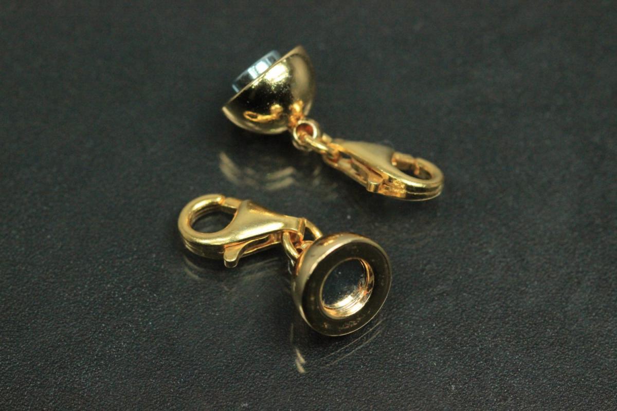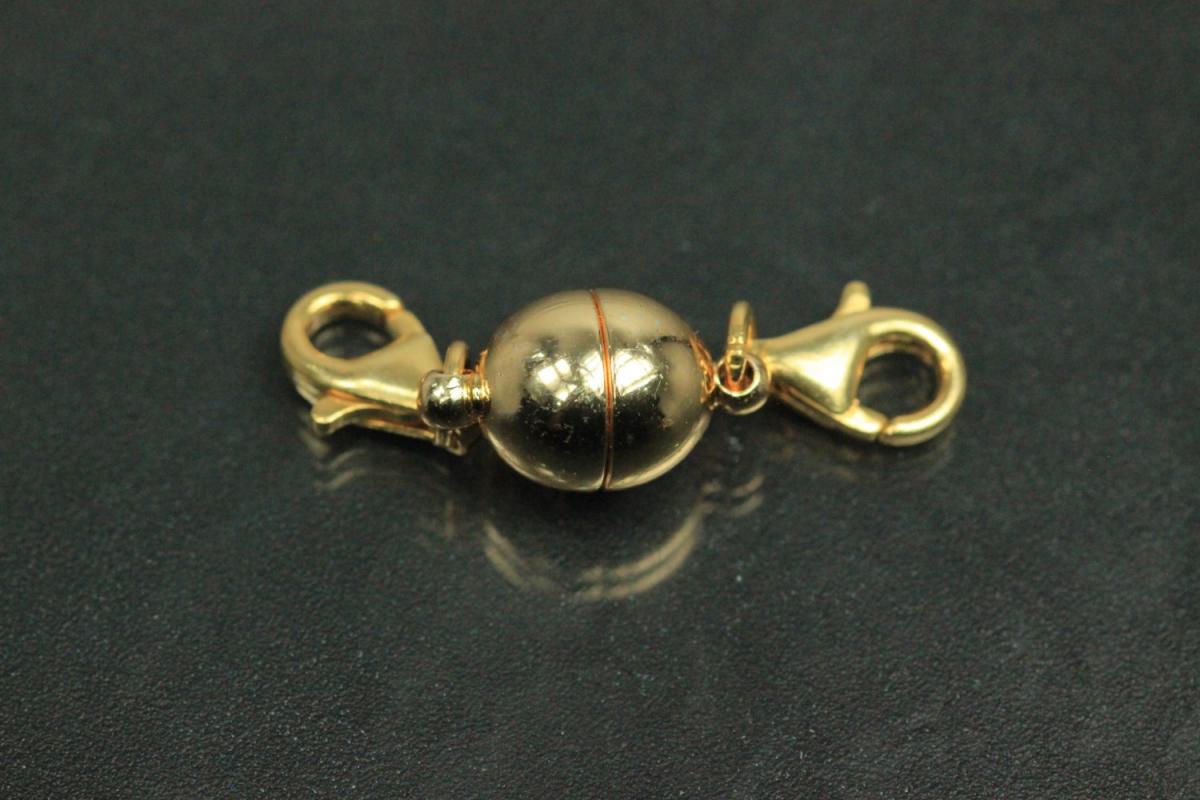 Our Steiner Vario clasps, each consisting of a magnetic clasp and two trigger clasps in 925/- silver or variant two consisting of a magnetic clasp and two trigger clasps in 925/- silver but in addition to each trigger clasps a Steiner power cap, also in 925/- silver, were sometimes included Electroplated and manufactured with high-quality gold or rhodium. Ideal for our jewelry designers and goldsmiths. This exceptional jewelry clasp generally serves as a clasp between two chain ends of a necklace. However, it has the special feature of opening a carrying necklace on the magnetic clasp as well as opening the trigger clasp and remounting and using it on another chain or necklace as a locking mechanism. With this Steiner Vario clasp you can vary between many chain models and do not need an additional clasp. This clasp fits many stringing materials such as rubber, stainless steel rings, silver or gold chains, silk ribbons or leather straps. Pearl necklaces and gemstone necklaces also achieve a great fit. There are almost no limits to your imagination when it comes to making jewelry. It should also be noted that magnetic clasps should not be heated as they could lose their magnetic force. Water or heavy body sweat can also cause severe damage. In order to rule out any possible health risks caused by magnetic radiation, sensitive people, especially those with pacemakers, should consult their family doctor before wearing them.