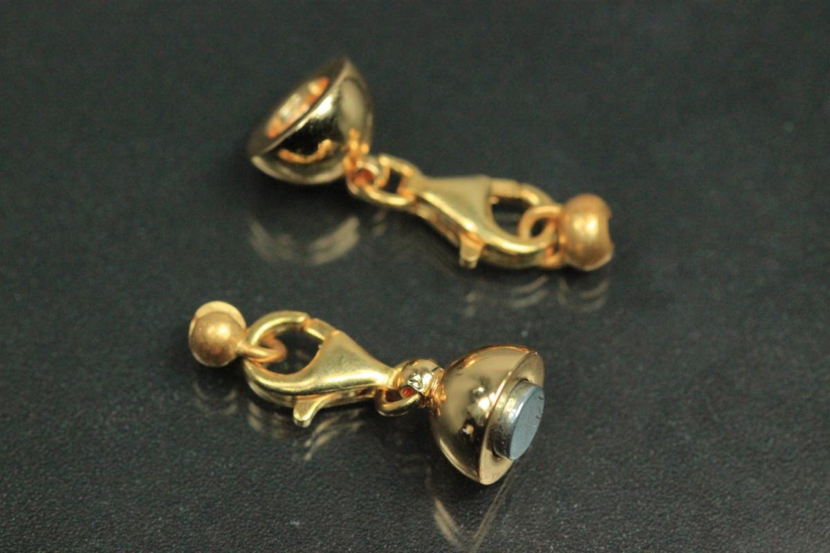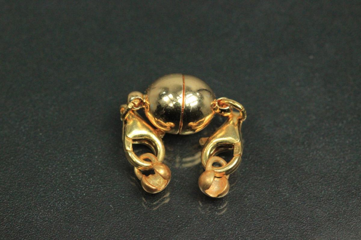 Our Steiner Vario clasps, each consisting of a magnetic clasp and two trigger clasps in 925/- silver or variant two consisting of a magnetic clasp and two trigger clasps in 925/- silver but in addition to each trigger clasps a Steiner power cap, also in 925/- silver, were sometimes included Electroplated and manufactured with high-quality gold or rhodium. Ideal for our jewelry designers and goldsmiths. This exceptional jewelry clasp generally serves as a clasp between two chain ends of a necklace. However, it has the special feature of opening a carrying necklace on the magnetic clasp as well as opening the trigger clasp and remounting and using it on another chain or necklace as a locking mechanism. With this Steiner Vario clasp you can vary between many chain models and do not need an additional clasp. This clasp fits many stringing materials such as rubber, stainless steel rings, silver or gold chains, silk ribbons or leather straps. Pearl necklaces and gemstone necklaces also achieve a great fit. There are almost no limits to your imagination when it comes to making jewelry. It should also be noted that magnetic clasps should not be heated as they could lose their magnetic force. Water or heavy body sweat can also cause severe damage. In order to rule out any possible health risks caused by magnetic radiation, sensitive people, especially those with pacemakers, should consult their family doctor before wearing them.