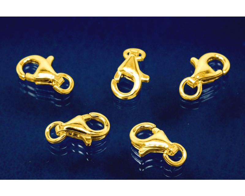 Pear shape trigger clasp in 925/000 silver gold plated with ring, approx. size lenght 9mm x width 5,0mm, approx. size loop outsideØ 3,5mm, insideØ 2,0mm, thickness Ø 0,7mm.This clasps can be used in the jewelry manufactures for necklaces, chains for mens and women, or for bracelets. Also you can take it as connector for charms and pendants.
