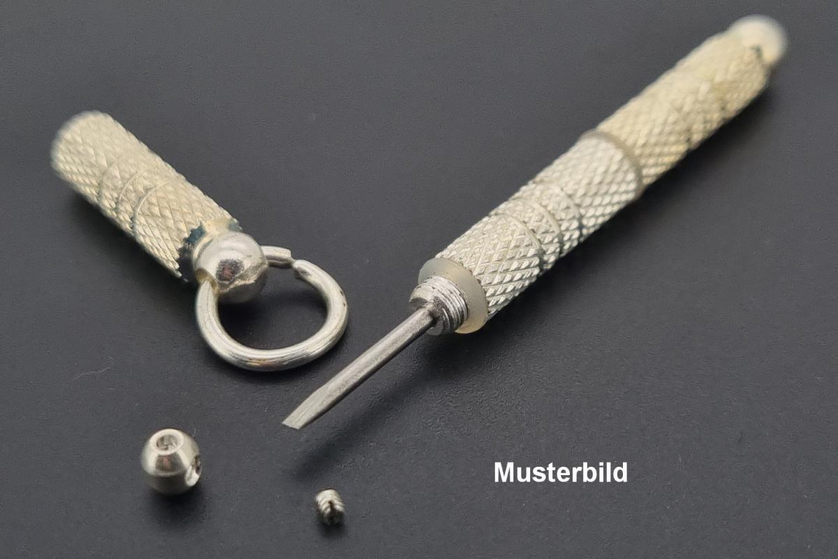 Diese spezielle Schraubencrimp ist passend für unseren Crimpschraubenzieher und bietet eine hervorragende Alternative zu herkömmlichen Crimpmethoden, die Crimpröhrchen, Crimpkugeln und die dazugehörige Originalcrimpzange verwenden. Im Vergleich zu diesen herkömmlichen Methoden hat das Schraubencrimpverfahren einen entscheidenden Vorteil: Es ermöglicht eine problemlose Demontage des Schmuckseils. Der Schraubenzieher enthält zwei Ersatzschrauben. Das Rückteil des Werkzeugs ist mit einer Kugel versehen, die abgeschraubt werden kann. Im abschraubbaren Vorderteil mit einer Öse befindet sich der eigentliche Schraubendreher, der für die Schraubencrimps verwendet wird. Dieser Schraubendreher ist speziell auf die verschiedenen Ausführungen und Größen der Schraubencrimps abgestimmt. Führen Sie Ihr nylonummanteltes Edelstahlseil durch die Öffnung der Schraubencrimp. Verwenden Sie den integrierten Schraubendreher, um die Schraube zu schließen. Falls gewünscht, können Sie zusätzlich eine passende Crimpcover verwenden, um die Schraubencrimp zu verarbeiten und zu verschönern. Im Gegensatz zur traditionellen Crimpmethode, bei der die Verbindung dauerhaft ist, kann die Schraubencrimp-Verbindung leicht wieder gelöst werden. Dies ermöglicht es, das Schmuckseil bei Bedarf problemlos anzupassen oder zu reparieren. Dieses Werkzeug ist somit eine ideale Wahl für diejenigen, die Flexibilität und einfache Handhabung bei der Herstellung von Schmuck bevorzugen.