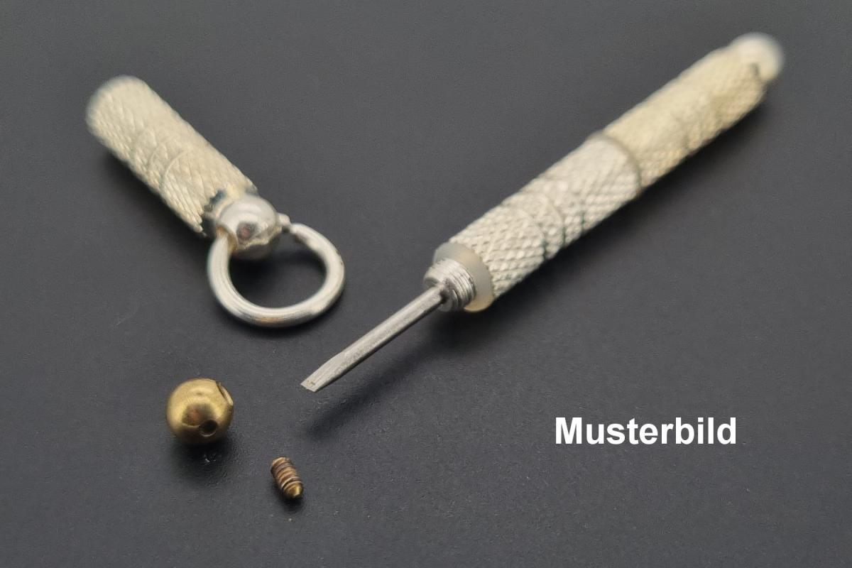 Diese spezielle Schraubencrimp ist passend für unseren Crimpschraubenzieher und bietet eine hervorragende Alternative zu herkömmlichen Crimpmethoden, die Crimpröhrchen, Crimpkugeln und die dazugehörige Originalcrimpzange verwenden. Im Vergleich zu diesen herkömmlichen Methoden hat das Schraubencrimpverfahren einen entscheidenden Vorteil: Es ermöglicht eine problemlose Demontage des Schmuckseils. Der Schraubenzieher enthält zwei Ersatzschrauben. Das Rückteil des Werkzeugs ist mit einer Kugel versehen, die abgeschraubt werden kann. Im abschraubbaren Vorderteil mit einer Öse befindet sich der eigentliche Schraubendreher, der für die Schraubencrimps verwendet wird. Dieser Schraubendreher ist speziell auf die verschiedenen Ausführungen und Größen der Schraubencrimps abgestimmt. Führen Sie Ihr nylonummanteltes Edelstahlseil durch die Öffnung der Schraubencrimp. Verwenden Sie den integrierten Schraubendreher, um die Schraube zu schließen. Falls gewünscht, können Sie zusätzlich eine passende Crimpcover verwenden, um die Schraubencrimp zu verarbeiten und zu verschönern. Im Gegensatz zur traditionellen Crimpmethode, bei der die Verbindung dauerhaft ist, kann die Schraubencrimp-Verbindung leicht wieder gelöst werden. Dies ermöglicht es, das Schmuckseil bei Bedarf problemlos anzupassen oder zu reparieren. Dieses Werkzeug ist somit eine ideale Wahl für diejenigen, die Flexibilität und einfache Handhabung bei der Herstellung von Schmuck bevorzugen.