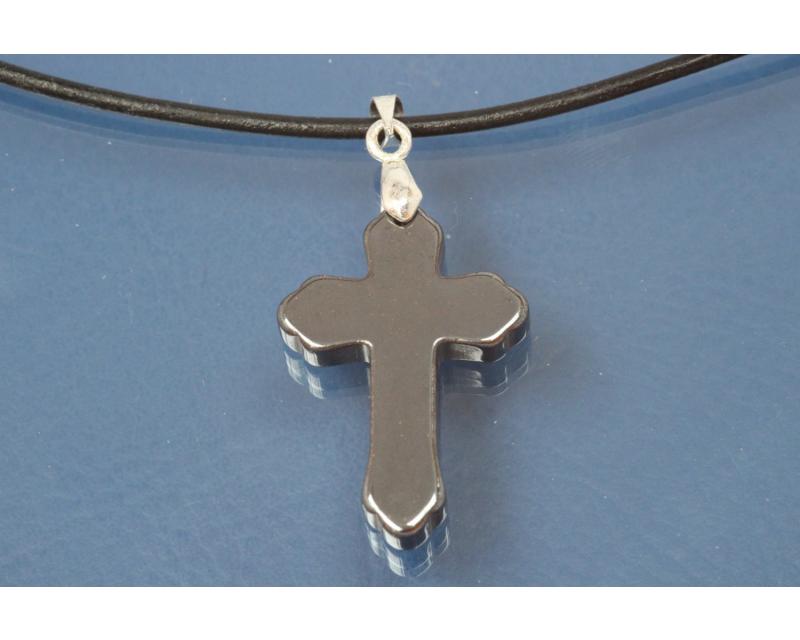 Necklace, leather cord Ø2mm, with Hematite pendant cross, length adjustable 32cm to 60cm