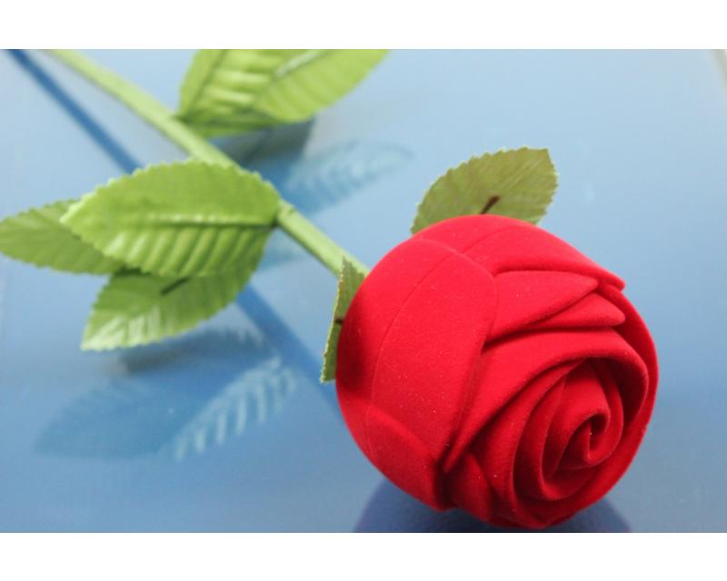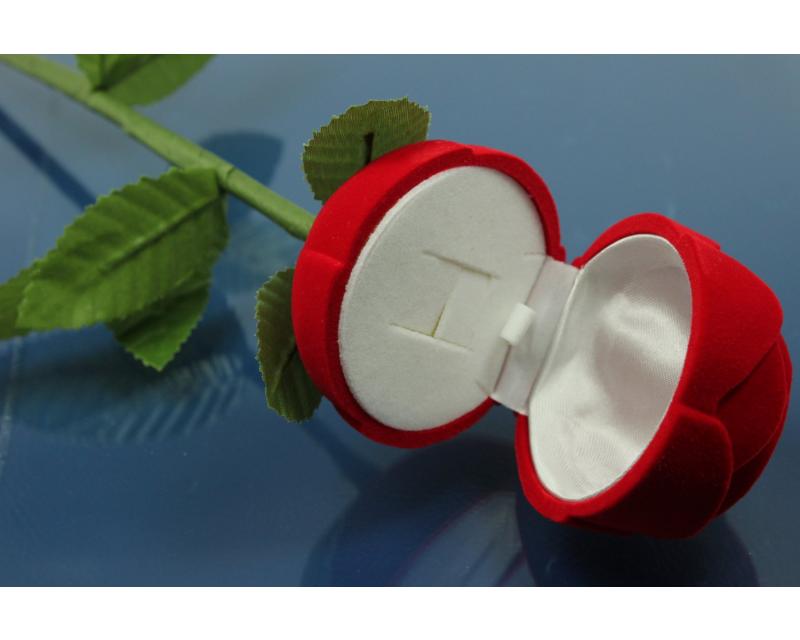 Ring Case rose shape with 2 leaves with stalk, flocked, outside red, inside white, ca.285mm long