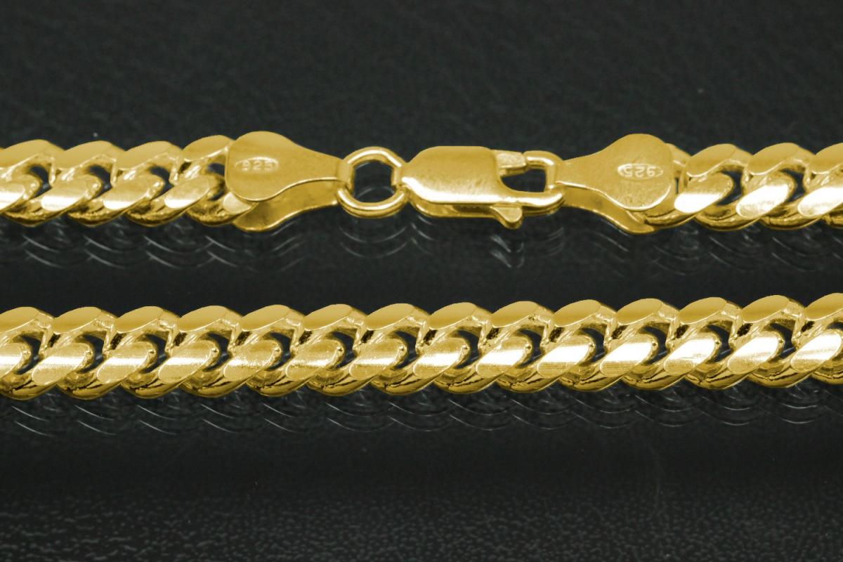 Panzerkette gedrückt 925/- Silber vergoldet mit Karabiner ca. Breite 4,9mm, in verschiedenen Längen erhältlich. Tauchen Sie ein in die Stärke und Robustheit unserer Panzerkette in 925er Silber. Diese schwere Ausführung ist inspiriert von den Kettenlaufwerken eines Panzers und strahlt eine unvergleichliche Männlichkeit aus. Die bombierte Form der Kettenglieder erinnert an die Laufposter eines Panzers und verleiht der Kette ein markantes, kraftvolles Design. Tragen Sie diese Kette, um Ihre innere Stärke und Entschlossenheit zu unterstreichen. Ein Ausdruck von Stil und Kraft, der Ihre Persönlichkeit perfekt widerspiegelt. Diese Silberkette 925/- Silber ist massiv (nicht hohl oder teilhohl) mit Karabinerverschluss und besitzt ein gedrücktes auch bombiert genanntes ovales Design.Die Kettenmuster ca. Maße, Breite 4,9mm, Höhe 2,3mm, ca Maße Endglied Breite 5,0mm, Höhe 2,7mm, (Sämtliche ca.Maße wurden an der höchsten und breitesten und stärksten Seite bzw. Fläche gemessen. Sollten sich die ca. Maße um ein Endteil- bzw. Endstück handeln, sind diese maßgebend für die Schlaufeninnenmaße des aufzufädelnden Teils bzw. Anhängers). Die Oberfläche wurde poliert und zum Schutz des Grundmetalles 925/- Sterlingsilber und als zusätzlichen Anlaufschutz galvanisch mit hochwertigem Gold veredelt. Gewicht per Stück ca. 23,66gr.
