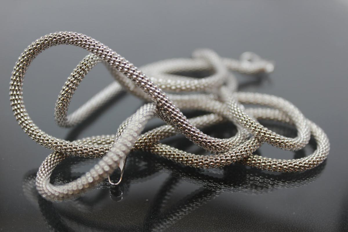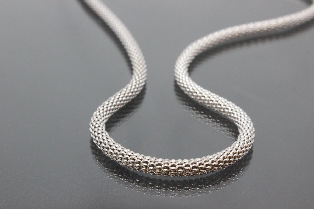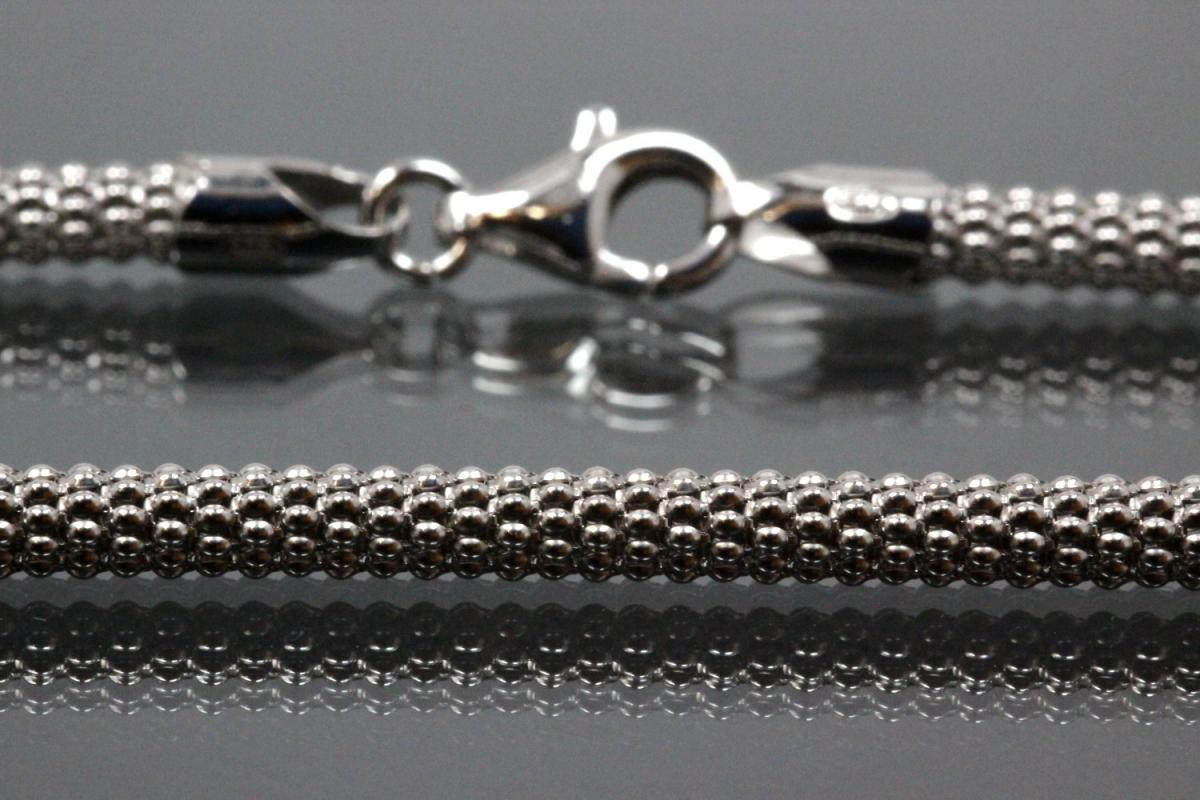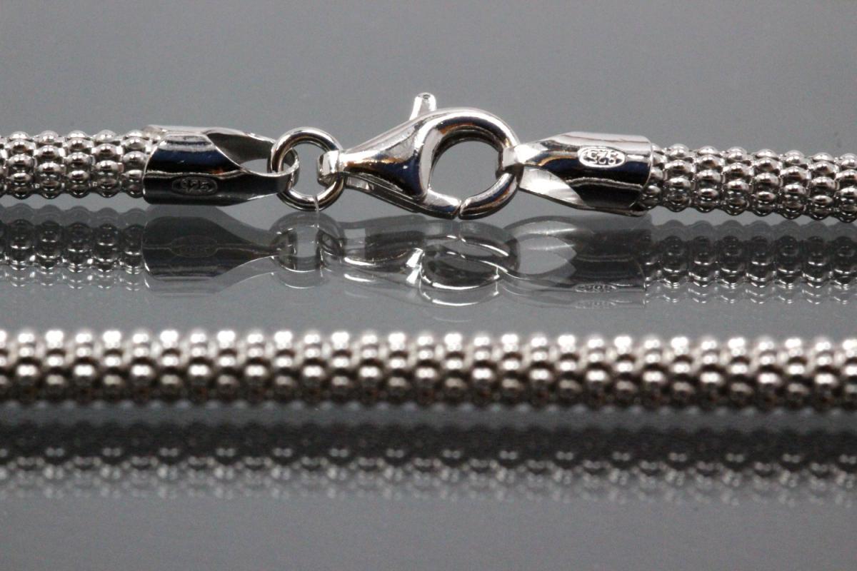 Popkornkette ca.Maße Ø3,7mm mit Karabiner, 925/- Silber rhodiniert, ca. Maße Endglied AØ 4,4mm, (Sämtliche ca.Maße wurden an der höchsten und breitesten und stärksten Seite bzw. Fläche gemessen. Sollten sich die ca. Maße um ein Endteil- bzw. Endstück handeln, sind diese maßgebend für die Schlaufeninnenmaße des aufzufädelnden Teils bzw. Anhängers). Die Oberfläche wurde poliert und zum Schutz des Grundmetalles 925/- Sterlingsilber und als zusätzlichen Anlaufschutz galvanisch mit hochwertigem Rhodium veredelt.
