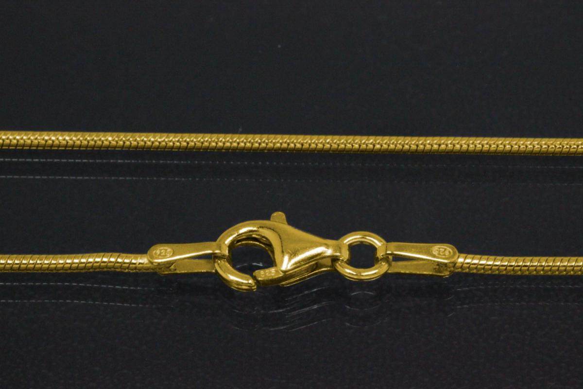 Schlangenkette 925/- Silber vergoldet mit Karabiner, ca Maße Ø 1,00mm, in verschiedenen Längen erhältlich. "Entdecken Sie unsere exquisit gestaltete Silberkette aus 925er Sterling Silber – eine wahre Hommage an zeitlose Eleganz und subtile Raffinesse. Die glatte Oberfläche, die an die Anmut der Schlangenhaut erinnert, verleiht diesem Schmuckstück eine unvergleichliche Schönheit.Diese Kette wurde speziell für stilbewusste Frauen entworfen, die dezente Eleganz schätzen. Ihr angenehmer Tragekomfort und ihre Leichtigkeit machen sie zur perfekten Wahl für jeden Anlass. Ob im Büro, bei einem romantischen Abendessen oder einem geselligen Treffen mit Freunden, diese Kette ergänzt Ihren Stil auf subtile und ansprechende Weise.Verleihen Sie Ihrem Outfit den letzten Schliff und setzen Sie ein Zeichen für zeitlose Schönheit und Geschmack. Entdecken Sie noch heute die Schönheit von 925er Sterling Silber in Form unserer glatten Schlangenhaut-inspirierten Silberkette – Ihr neues Lieblingsaccessoire für einen Look, der immer im Trend liegt. Diese Kette ist massiv (nicht hohl oder teilhohl) mit Karabiner, ca Maße Kettendesign Ø1,00mm, ca Maße Endglied Breite Ø1,50mm, Höhe 2,3mm,(Sämtliche ca.Maße wurden an der höchsten und breitesten und stärksten Seite bzw. Fläche gemessen. Sollten sich die ca. Maße um ein Endteil- bzw. Endstück handeln, sind diese maßgebend für die Schlaufeninnenmaße des aufzufädelnden Teils bzw. Anhängers). Die Oberfläche wurde poliert und zum Schutz des Grundmetalles 925/- Sterlingsilber und als zusätzlichen Anlaufschutz galvanisch mit hochwertigem Gold veredelt. Gewicht per Stück ca. 3,68gr.