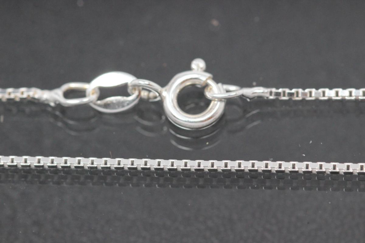 Venezianer-Collierkettchen 50cm lang, mit Federring, 925/- Silber, 0,95mm breit, Endglied Öse Außen Ø 3,6mm, Drahtstärke Ø 0,65mm,(Sämtliche ca.Maße wurden an der höchsten und breitesten und stärksten Seite bzw. Fläche gemessen. Sollten sich die ca. Maße um ein Endteil- bzw. Endstück handeln, sind diese maßgebend für die Schlaufeninnenmaße des aufzufädelnden Teils bzw. Anhängers). Die Oberfläche wurde poliert und zum Schutz des Grundmetalles 925/- Sterlingsilber und als zusätzlichen Anlaufschutz galvanisch mit hochwertigem Silber veredelt. Gewicht per Stück ca. 2,7gr