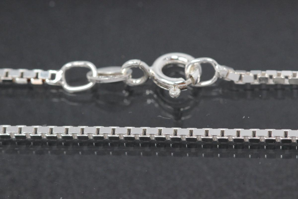 Venezianer-Collierkettchen 50cm lang, mit Federring, 925/- Silber, 1,30mm breit, Endglied Öse Außen Ø 3,0mm, Drahtstärke Ø 0,65mm, (Sämtliche ca.Maße wurden an der höchsten und breitesten und stärksten Seite bzw. Fläche gemessen. Sollten sich die ca. Maße um ein Endteil- bzw. Endstück handeln, sind diese maßgebend für die Schlaufeninnenmaße des aufzufädelnden Teils bzw. Anhängers). Die Oberfläche wurde poliert und zum Schutz des Grundmetalles 925/- Sterlingsilber und als zusätzlichen Anlaufschutz galvanisch mit hochwertigem Silber veredelt. Gewicht per Stück ca. 5,3gr