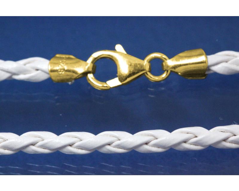 Collier, Lederkordel weiss Ø3mm, mit Karabiner 925/- Silber vergoldet, Länge 45cm