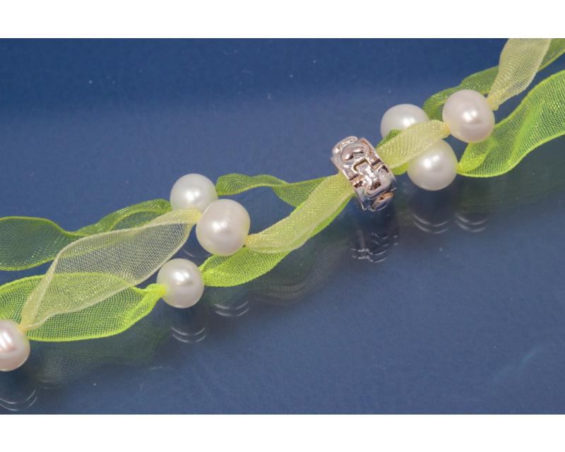 Organza-Collier 3rhg. jadegrün / zitronengelb / neongelb mit 36 Süßwasserperlen und 4 Metall-Clips silberfarben, Länge ca. 70cm