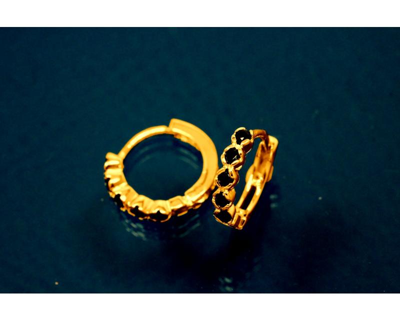 aLEm Klappcreolen 925/-Silber ca.Maße AØ12,6mm, IØ8,6mm, MS2,0mm, Breite 2,0mm. Mit schwarzen runden Zirkonia in Zargen wurden sie an der vorderen Hälfte ( Frontseite ) ausgefasst. Die hintere Hälfte wurde mit Luftkader versehen. Eine Scharnierbewegung auf der Unterseite läßt das Öffnen der Klappcreole zu. Den Schließmechanismus übernimmt ein halbrund gebogener runder Bügel, an dem am vorderen Ende eine Kerbe eingearbeitet wurde. Diese rastet auf der gegenüberliegenden Hälfte in die davor gesehene Aussparung ein. Die Oberfläche wurde poliert und zum Schutz des Grundmaterials 925/- Sterlingsilber und als zusätzlichen Anlaufschutz galvanisch vergoldet. Gewicht per Stück ca.0,75gr