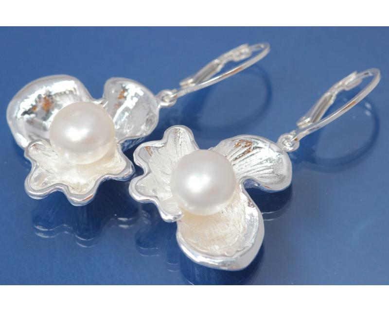 Ohrhänger Blume mit Perle SW - Perle 925/- Silber poliert, ca.Maße H 41,0mm incl Brisur, B 23,5mm,mit SW-Perle ca.Maße Ø10,0mm. Die Oberfläche wurde poliert und zum Schutz des Grundmetalles 925/- Sterlingsilber und als zusätzlichen Anlaufschutz galvanisch mit hochwertigem Silber veredelt. Gewicht per Stück ca.5,6gr