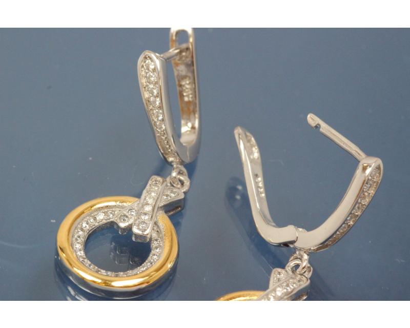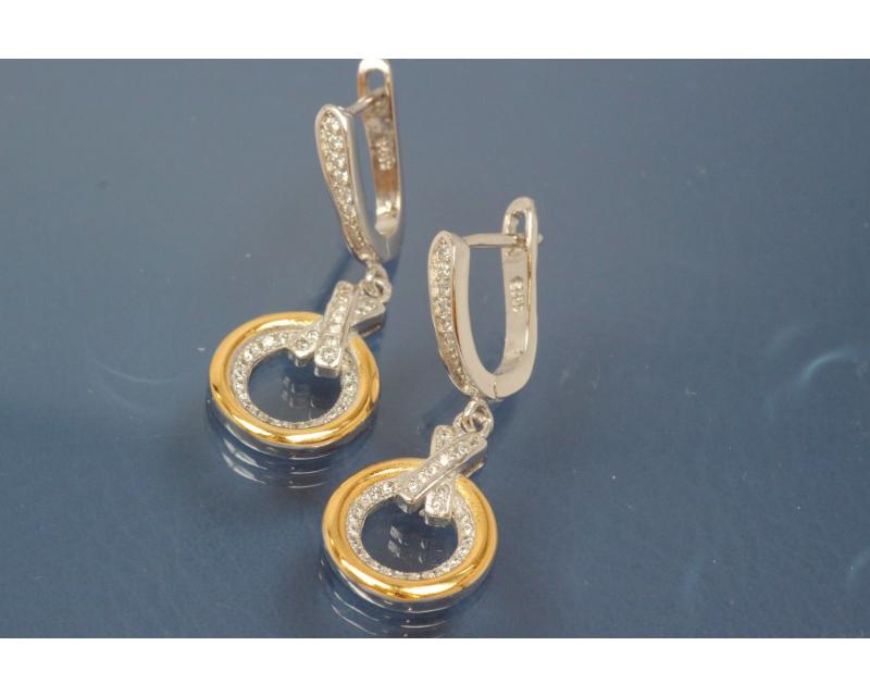Ohrhänger mit gefasster Brisur 925/- Silber ca. Maße H35,0mm incl. Brisur, B14,0mm rhodiniert / teilvergoldet mit Zirkonia. Auch wurden funkelnde facettierte Zirkonia im Brillantschliff im Verschnitt eingefasst. Die Oberfläche wurde poliert und zum Schutz des Grundmetalles 925/- Sterlingsilber und als zusätzlichen Anlaufschutz galvanisch mit hochwertigem Gold und Rhodium in bicolor veredelt. Gewicht per Stück ca.3,3gr